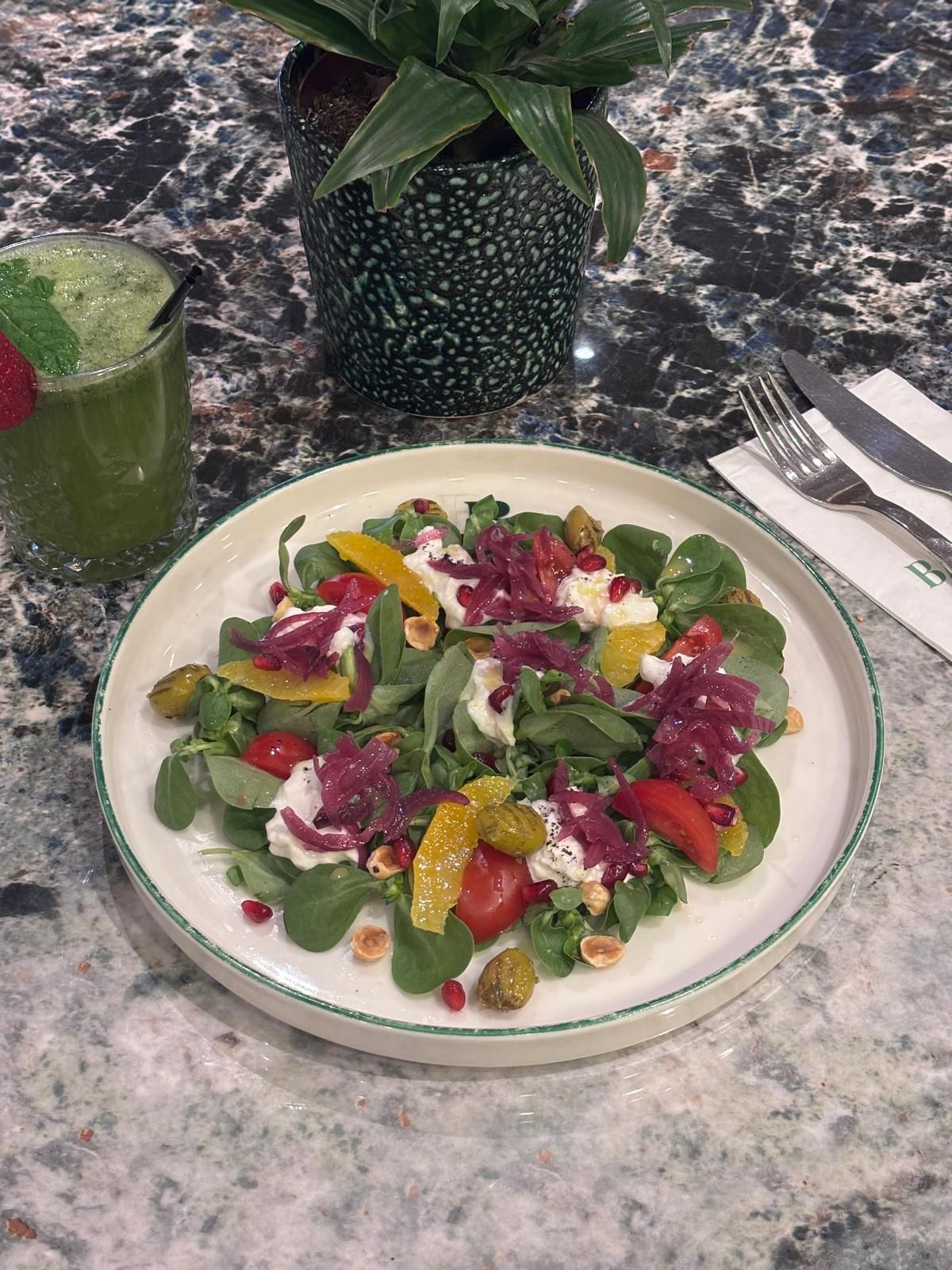 Rose lettuce, arugula, mediterranean greens, avocado, baked tomatoes, french beans, lemon sauce, tangerine and olive oil