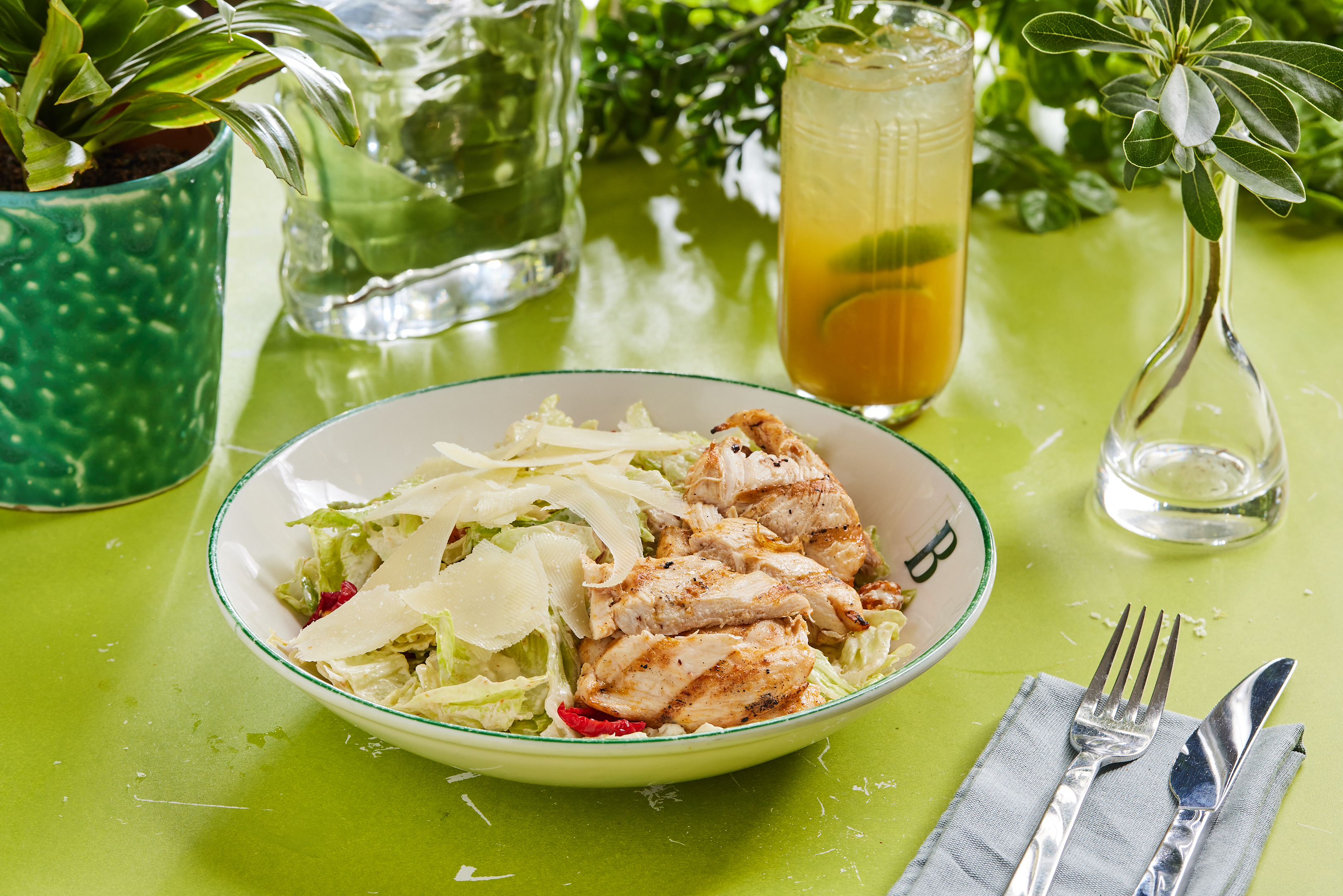 Caesar sauce, grilled chicken with crouton bread, iceberg lettuce, parmesan, dried tomato