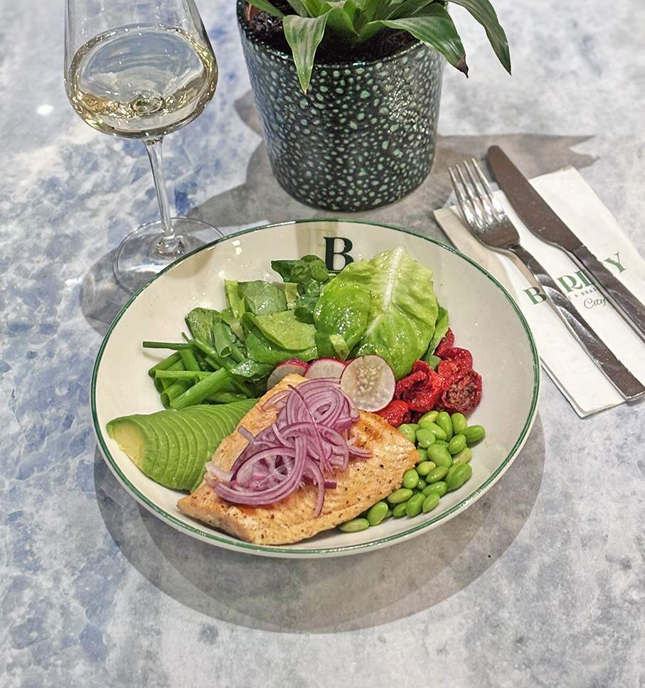 Grilled salmon, arugula, lettuce, Mediterranean greens, quinoa, avocado, red onion, capers, oven-roasted tomatoes, oil-lemon sauce, French beans